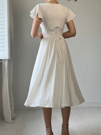 Flutter sleeves and a floaty skirt create graceful movement as you walk, while the double-layered fabric offers full coverage and lasting comfort. The reversible neckline and our signature corset ties give you the freedom to style Ava your way - to suit your shape, your mood and the occasion. A forever piece that’s both effortless and enchanting.
